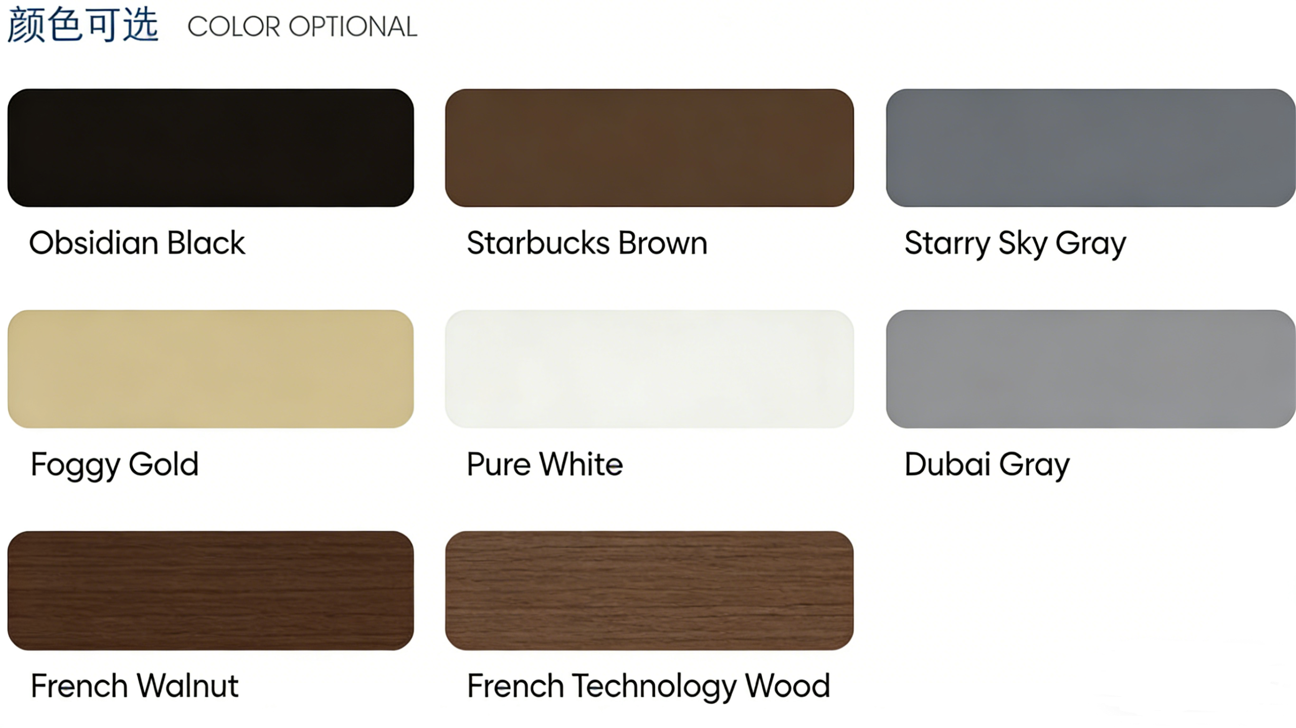 Fluorocarbon Champagne Gold, Great Wall Grey, Star Bar Coffee, Enamel White, Enamel Black, Lilac Pear Wood, Snowflake Pear Wood